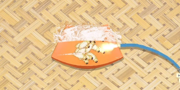 2、我们把右侧袋装清洁粉倒蚕蛹上,用水管冲洗净。