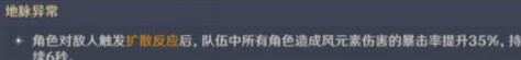 地脉异常:角色对敌人触发扩散反应后,队伍中所有角色造成风元素伤害的暴击率提升35%,持*6*。