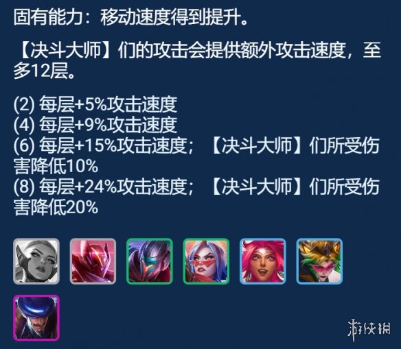 季中赛季决斗羁绊大改 ,现在决斗增加的攻速略有下降,但6/8羁绊加持下,菲奥娜搭配鬼索也能快速达成5/S攻速,且现在6/8决斗羁绊还增加了减伤,这让阵容整体坦度大幅度提升,不似上赛季那样脆皮了。