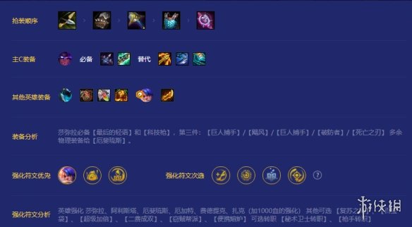 莎弥拉必备【最后的轻语】和【科技枪】,第三件:【巨人捕手】/【飓风】/【巨人捕手】/【破防者】/【死亡之刃】 多余物理装备给【厄斐琉斯】。