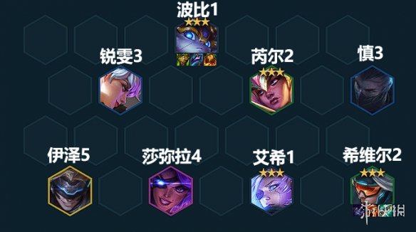 阵容组成:伊泽、锐雯、波比、莎弥拉、艾希、芮尔、慎、希维尔