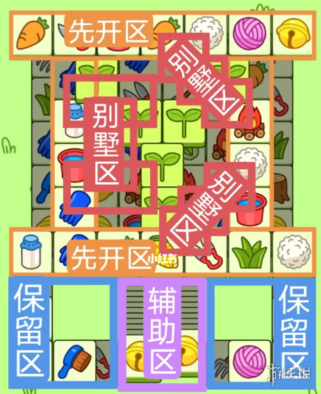 1.一个工字型大别墅,两个斜着的长形别墅,开局先消除橙色区,然后按照一层层均匀消除表面牌。