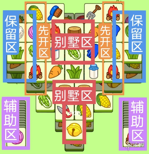 一个工字型大别墅,两个斜着的长形别墅,开局先消除橙色区,然后按照一层层均匀消除表面牌。哪里压牌比较多就先消除哪里,必要时可以用盲盒区辅助消除表面牌。尽量还是以别墅区内互相消除为主,蓝色区有叠牌,但是不多,全部保留到后期使用。