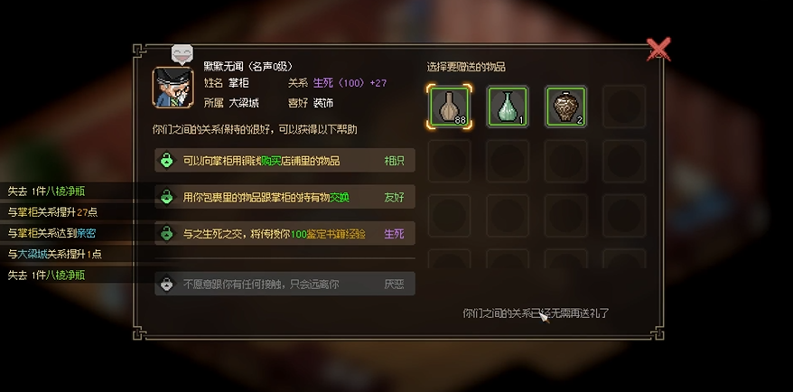 1、赠送八棱净瓶,增加27点好感,直至关系到达【生死】。