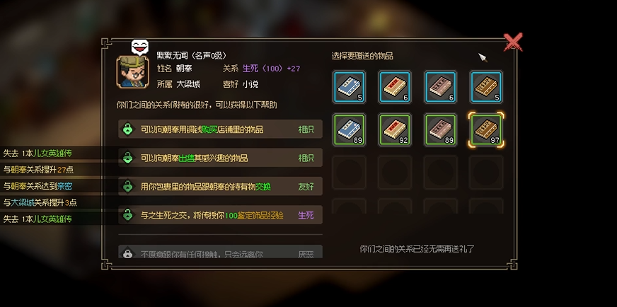 1、赠送儿女英雄传,增加27点好感,直至关系到达【生死】。