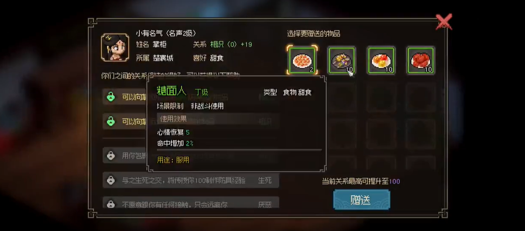 1、一直送礼物可以增加好感度至生死之交,即可获得制造防具经验。