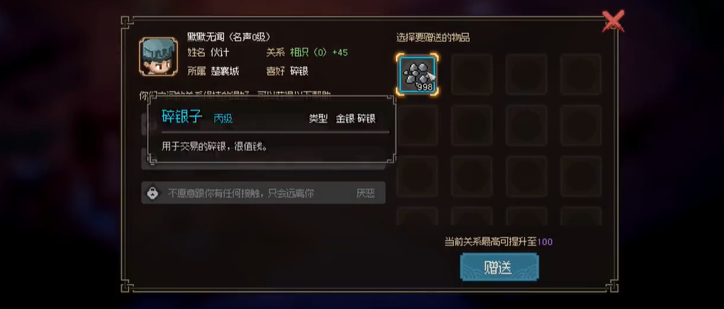 1、一直送礼物可以增加好感度至生死之交,即可获得口才经验。