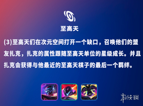 3——【至高天】们开启一个跨维度裂隙并召唤他们的友军【扎克】,【扎克】的强度将随【至高天】弈子们的星级提升而增长。【扎克】还会获得相距最近的那名【至高天】的最底部羁绊。