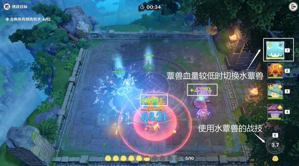 场上蕈兽血量较低时,使用咚咚小圆帽(水蕈兽)的战技,回复场上蕈兽的血量。