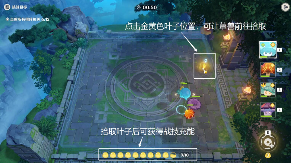 点击金色叶子位置,可让蕈兽前往拾取,拾取叶子后会获得蕈兽的战技充能。