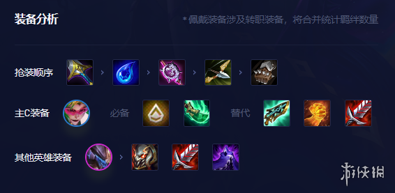阵容主C薇恩,AI转职与朔极之矛必备,这是阵容核心装备。第三件建议科技枪刃,可给阵容大幅度增加续航能力,如果没有也可用正义之手,但需要阵容坦度装备较为优质。