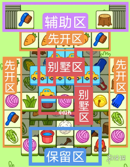 2.必要时可以用盲盒区辅助消除表面牌,尽量还是以别墅区内互相消除为主。
