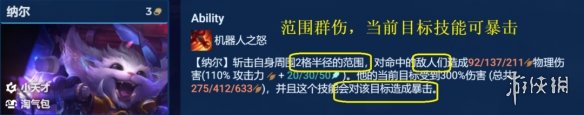 本来以为黑客砍了,纳尔就不能玩,但经过测试强度还挺不错,3局偷了小100分,还是比较稳定的。主C纳尔其技能是2格范围群伤,纯物理伤害,且还能对当前主目标造成暴击,其输出效率是比较高的。