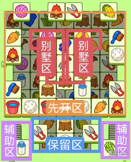 一个工字型大别墅,一个T字型大别墅。开局先消除橙色区,这里压牌比较多,然后按照一层层均匀消除表面牌。必要时可以用盲盒区辅助消除表面牌尽量还是以别墅区内互相消除为主,蓝色区有叠牌,但是不多,全部保留到后期使用。