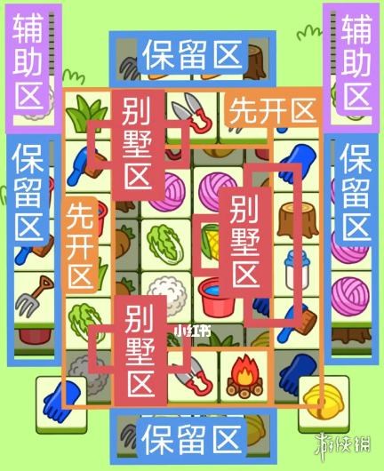 1.一个大三角形别墅,两个小十字形别墅,开局先消除橙色区,这个压牌比较多。