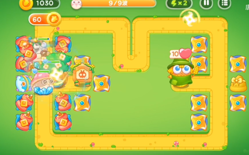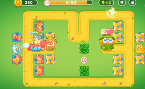 1、这一波是需要摆放上两个风扇塔的,显示攻击中间的障碍物来进行获取到金币。