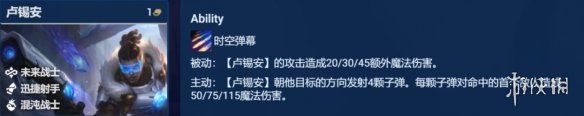 卢锡安这赛季物理攻击非常低,被动技能每次普攻都能造成额外的魔法伤害,主动技能发射4枚子弹造成中等魔法伤害,关键是这些是吃法强加成的,早高法强下每颗子弹都能造成200+魔法伤害输出会非常暴力,在1费能C的棋子中也是数一数二的。