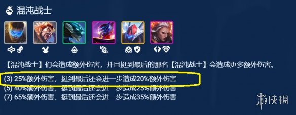 阵容给其搭配了3混沌与4迅射羁绊.3混沌直接给卢锡安增加25%额外伤害,大幅度提升其输出能力。