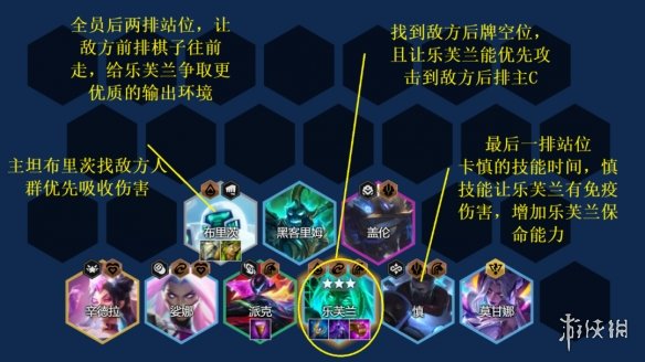 阵容前排搭配2护卫+布里茨,布里茨坦度较高,技能有减伤在坦度装备下能抗很久,在辅以而盖伦、派克、莫甘娜、娑娜与辛德拉的控制,能保证前排抗的更久,这就给乐芙兰争取到更优质的输出环境。