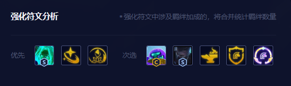 阵容比较吃专属符文,最优是乐芙兰的协助瞄准可极大增加输出强度,其次是布里茨的动态防御与慎的递归矩阵,可大幅度增加阵容坦度。其他增加群体收益的的专属符文也可考虑,就是强度会差很多。