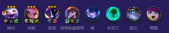 2费强化拿【安妮】-【嗜火】,3费强化拿纳尔【同步镀层】,5费强化拿【努努和威朗普】-【当面推球】。