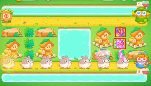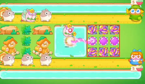 1、开局先是放一个火箭用来清理下边的道具,清理完之后再放一个魔法球,进行攻击兔子。