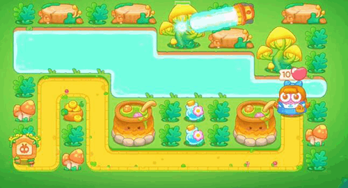 1、开局是在最上面放上激光手电筒,可以清理到下面的怪物和障碍。