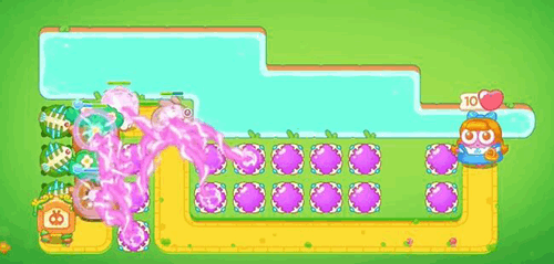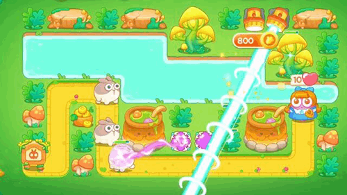 5、障碍清理完成之后,在出口左边放鱼骨右边放魔法球要同步进行升级,这样就快速的通关了。