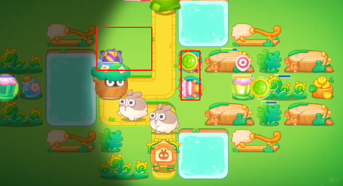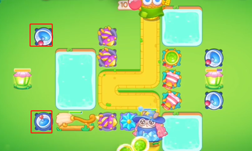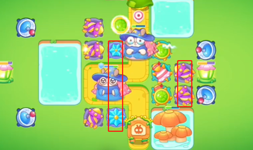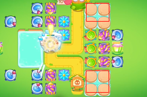 1、开局先是在中间放两个乌龟,攻击左上角的道具,空出位置就放一个火箭,再用乌龟清理右侧的道具。