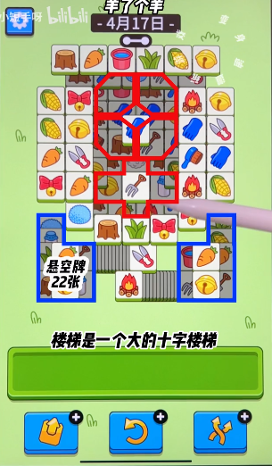 3、玩家只要从上往下平着消除就可以,楼梯都很简单,后期搭配悬空区、盲盒区的消除掉就可以了。