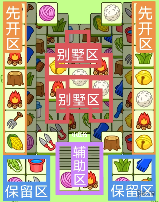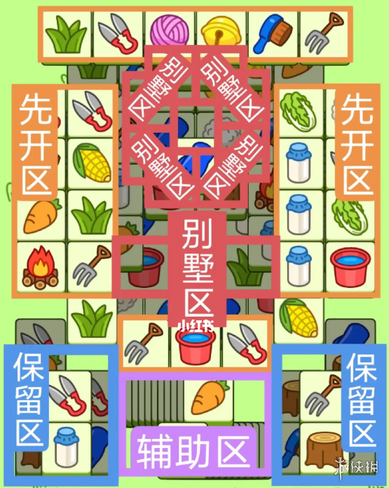 一个口字型别墅,4个双叠牌小别墅组成,一个十字型大别墅!开局先消除橙色区,这里压牌此较多。然后按照一层层均匀消除表面牌。不要跨层太多拿牌,必要时可以用盲盒区辅助消除表面牌,尽量还是以别墅区内互相消除为主。蓝色区有叠牌,但是不多,全部保留到后期使用。