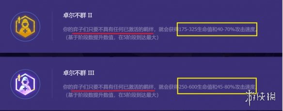 卓尔不群是上场棋子只要不触发羁绊就能获得增加攻速与生命值。并不是阵容不能有羁绊,如所有的怪兽棋子都无法触发卓尔不群,但上场不影响阵容其他无羁绊棋子享受卓尔不群的增益,在如精英羁绊只有在1或4羁绊的适合羁绊才能达成而2/3精英是可以享受到卓尔不群的收益的。