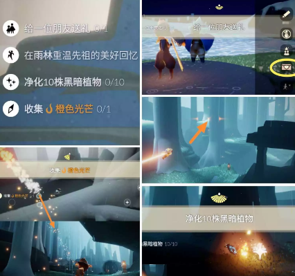 收集橙色光芒:橙光在雨林密林遗迹左侧鱼骨上方