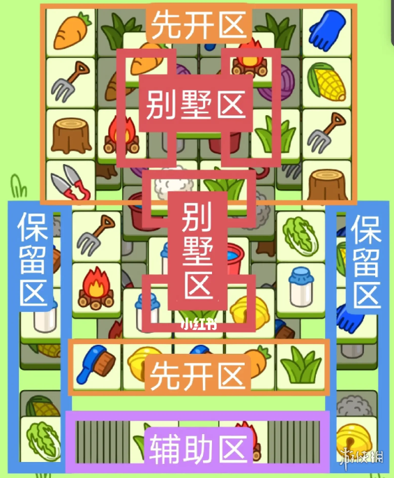 一个T字型大别墅,一个方形大别墅没有旋转楼梯,可以用缝隙看牌法探底牌,开局先消除橙色区,这里压牌此较多。然后按照一层层均匀消除表面牌,哪里压牌比较多就先消除哪里,必要时可以用盲盒区辅助消除表面牌,尽量还是以别墅区内互相消除为主,蓝色区有叠牌,但是不多,全部保留到后期使用。