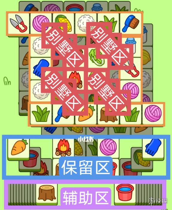 1、四个斜着的长形别墅组成,开局先消除橙色区,这里压牌比较多。