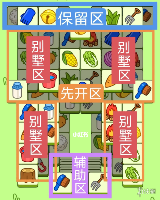 一个三角形大别墅,四个双叠牌小别墅,开局先消除橙色区,这里压牌比较多。然后按照一层层均匀消除表面牌。不要跨层太多拿牌,必要时可以用盲盒区辅助消除表面牌。尽量还是以别墅区内互相消除为王,蓝色区有叠牌,但是不多全部保留到后期使用。
