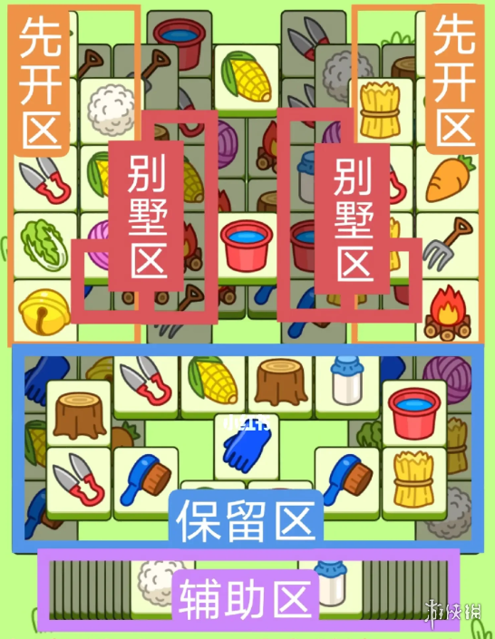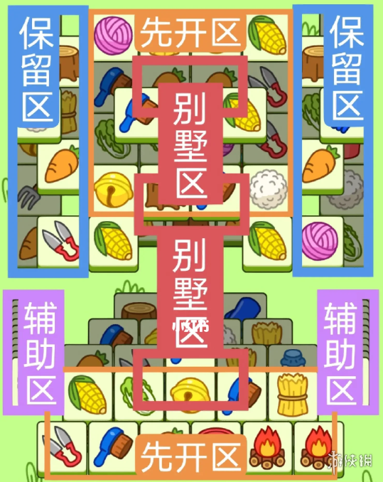 两个L字型大别墅,开局先消除橙色区,这里压牌此较多。然后按照一层层均匀消除表面牌,不要跨层太多拿牌,必要时可以用盲盒区辅助消除表面牌。尽量还是以别墅区内互相消除为主,蓝色区基本都是明牌,全部保留到后期使用。
