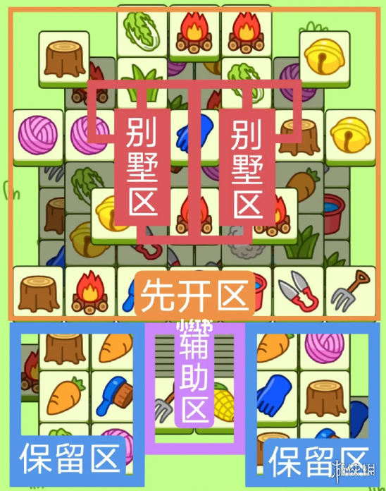 两个方形大别墅,由四个长形别墅组成,没有旋转楼梯可以用缝隙看牌法探底牌。镜面牌每消除组牌变化一次。变化到可用牌先放进卡槽,免得消失,主要先消除不变化的牌。开局先消除橙色区。然后按照一层层均包消除表面牌,必要时可以用盲盒区辅助消除表面牌。尽量还是以别墅区内互相消除为主,蓝色区有叠牌,但是不多,全部保留到后期使用。