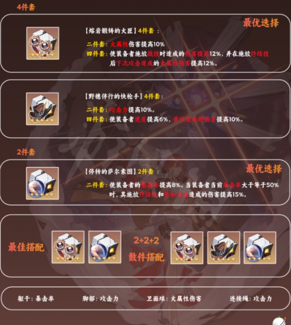 ① 「姬子」最优搭配就是【熔岩锻铸的火匠】4件套+【停转的萨尔索图】2件套。