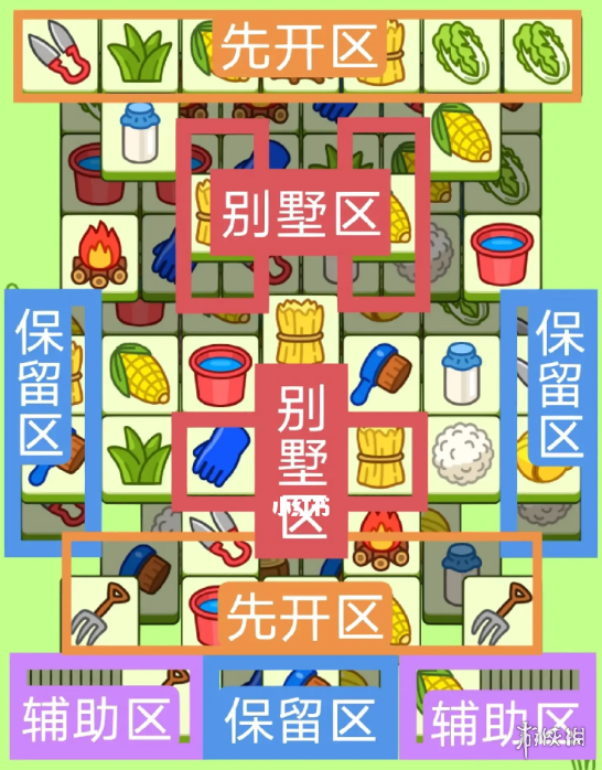 两个竖着的长形别墅,两个横着的长形别墅。可以参考缝隙看牌法探底牌,开局先消除橙色区,这里压牌比较多。然后按照一层层均匀消除表面牌,不要跨层太多拿牌。必要时可以用直盒区辅助消除表面牌,尽量还是以别墅区内互相消除为主,蓝色区基本都是明牌, 全部保留到后期使用。