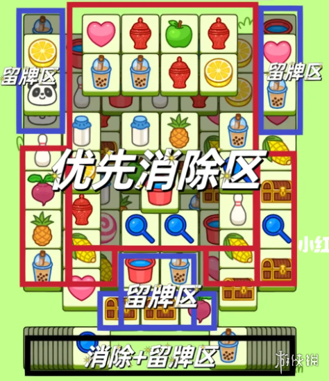 4.蓝色区域中前期尽量保留,后期再配合消除,努力每次都能和叠加区做消除,后面可以配合道具打乱顺序消除