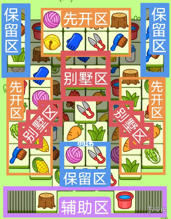 3.必要时可以用紫色盲盒区辅助消除,盲盒区后期不用留太多,留几张备用即可。