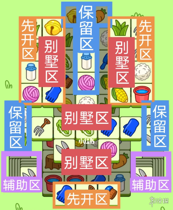 两个竖着的长形别墅,两个横着的长形别墅,可以用缝隙看牌法探底牌,开局先消除橙色区,这里压牌比较多。然后按照一层层均匀消除表面牌,不要跨层太多拿牌。必要时可以用盲盒区辅助消除表面牌。尽量还是以别墅区内互相消除为主,蓝色区有叠牌,但是不多,全部保留到后期使用。