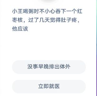 小王喝粥时误吞了一颗红枣核,过了几天觉得肚子疼该怎么办?2020年12月4日蚂蚁庄园最新答案