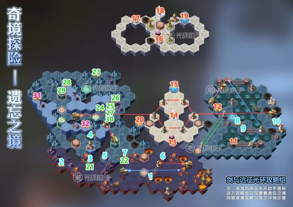 剑与远征遗忘之境合计起来有32步路线位置,为了帮助大家可以更好的弄清楚,每一步的操作跟前进的路线小编在这里都给大家完全的整理好了,只要大家跟着小编的攻略走,一定可以非常顺利的通关的!剑与远征遗忘之境通关路线图1.到1的位置,点击开关,使机关往下移动2.到2的位置,消灭沿途怪物阵营,获取奖励3.到3的位置,操纵绿色摇杆,改变立柱状态4.到4的位置,操纵黄色摇杆,改变立柱状态5.到5的位置,消灭怪物阵