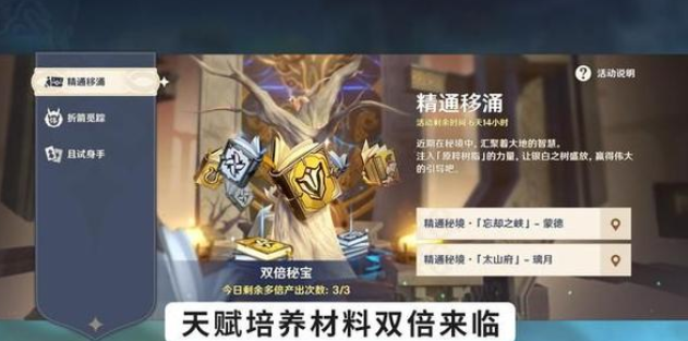 精通移涌活动是原神最新推出的一个活动,这个活动属于白嫖性质的活动,在这个活动期间玩家刷天副本的时候可以有三次话20体力领取双倍奖励的机会,那么我们到底该怎么玩这个精通移涌活动呢?小编今天给大家带来了精通移涌活动的详细攻略。原神精通移涌活动该怎么玩今天开天赋素材双倍掉落活动了,对于常年缺天赋书的我来说,真是太幸福了,不过在逛米游社的时候发现了一些大家(一般是萌新)容易忽略的点和会犯的小错误,所以总结