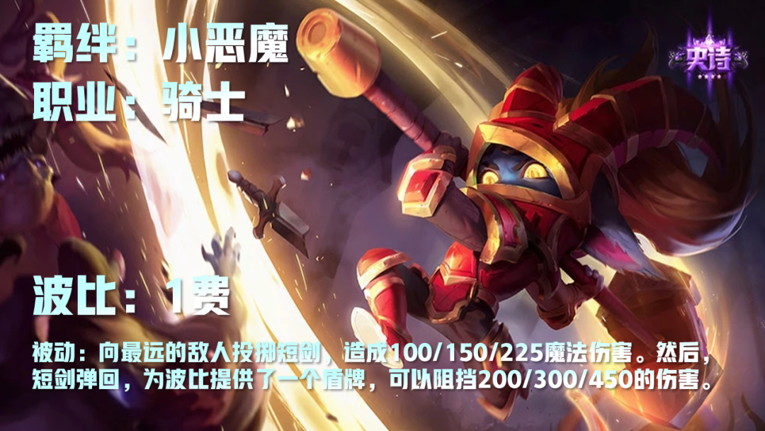 云顶之弈s5波比技能及羁绊是什么?全新的S5赛季将开启,可能很多的小伙伴们都想要提前了解一下关于波比这一角色在新赛季里面的变动,为了帮助大家更快的了解这一游戏角色在全新的赛季里面的相关信息,小编专门为大家整理出了相关的数据,希望大家会喜欢!云顶之弈s5波比技能及羁绊介绍波比1费英雄羁绊:小恶魔,骑士技能:波比向最远的敌人投掷盾牌,造成100/150/225魔法伤害。盾牌会在击中敌人后返回,为波比提