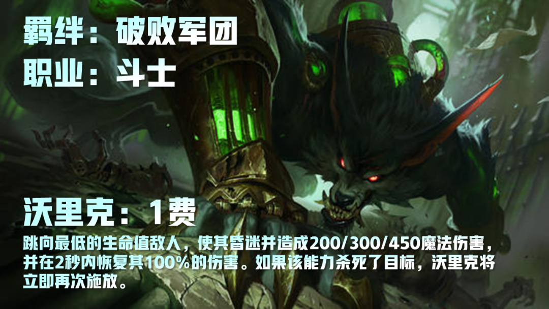 云顶之弈s5狼人沃里克技能及羁绊是什么?全新的S5赛季将开启,可能很多的小伙伴们都想要提前了解一下关于狼人沃里克这一角色在新赛季里面的变动,为了帮助大家更快的了解这一游戏角色在全新的赛季里面的相关信息,小编专门为大家整理出了相关的数据,希望大家会喜欢!云顶之弈s5狼人沃里克技能及羁绊介绍狼人沃里克1费英雄羁绊:破败军团,斗士技能:狼人沃里克冲向生命值最低的敌人,晕眩敌人并造成200/300/450