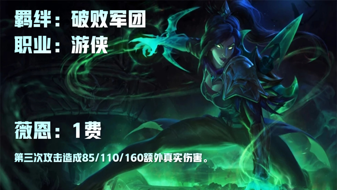 云顶之弈s5薇恩技能及羁绊是什么?全新的S5赛季将开启,可能很多的小伙伴们都想要提前了解一下关于薇恩这一角色在新赛季里面的变动,为了帮助大家更快的了解这一游戏角色在全新的赛季里面的相关信息,小编专门为大家整理出了相关的数据,希望大家会喜欢!云顶之弈s5薇恩技能及羁绊介绍薇恩1费英雄羁绊:破败军团,游侠技能:(被动)薇恩对同一目标的第3次攻击会造成85/110/160额外真实伤害!薇恩装备羊刀+水银