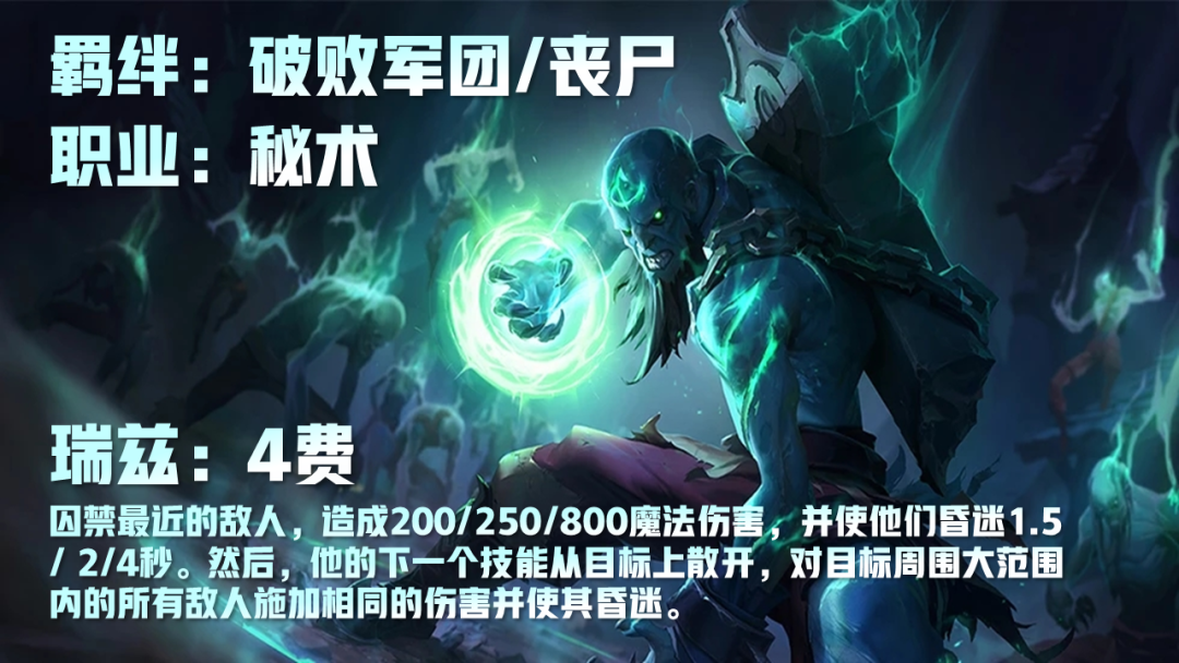 玩云顶之弈这款游戏的小伙伴们对于4费英雄瑞兹一定不会太陌生吧!那么,瑞兹在云顶之弈S5赛季的技能与羁绊是什么呢?本期小编为大家带来的是有关于云顶之弈s5瑞兹的技能及羁绊的详细介绍,感兴趣的小伙伴们欢迎来围观!云顶之弈s5瑞兹技能及羁绊介绍瑞兹4费英雄羁绊:丧尸,破败军团,秘术师技能:瑞兹禁锢最近的敌人,造成200/250/800魔法伤害并晕眩其1.5/2/4秒。他会强化下一次施法,对目标附近大范围